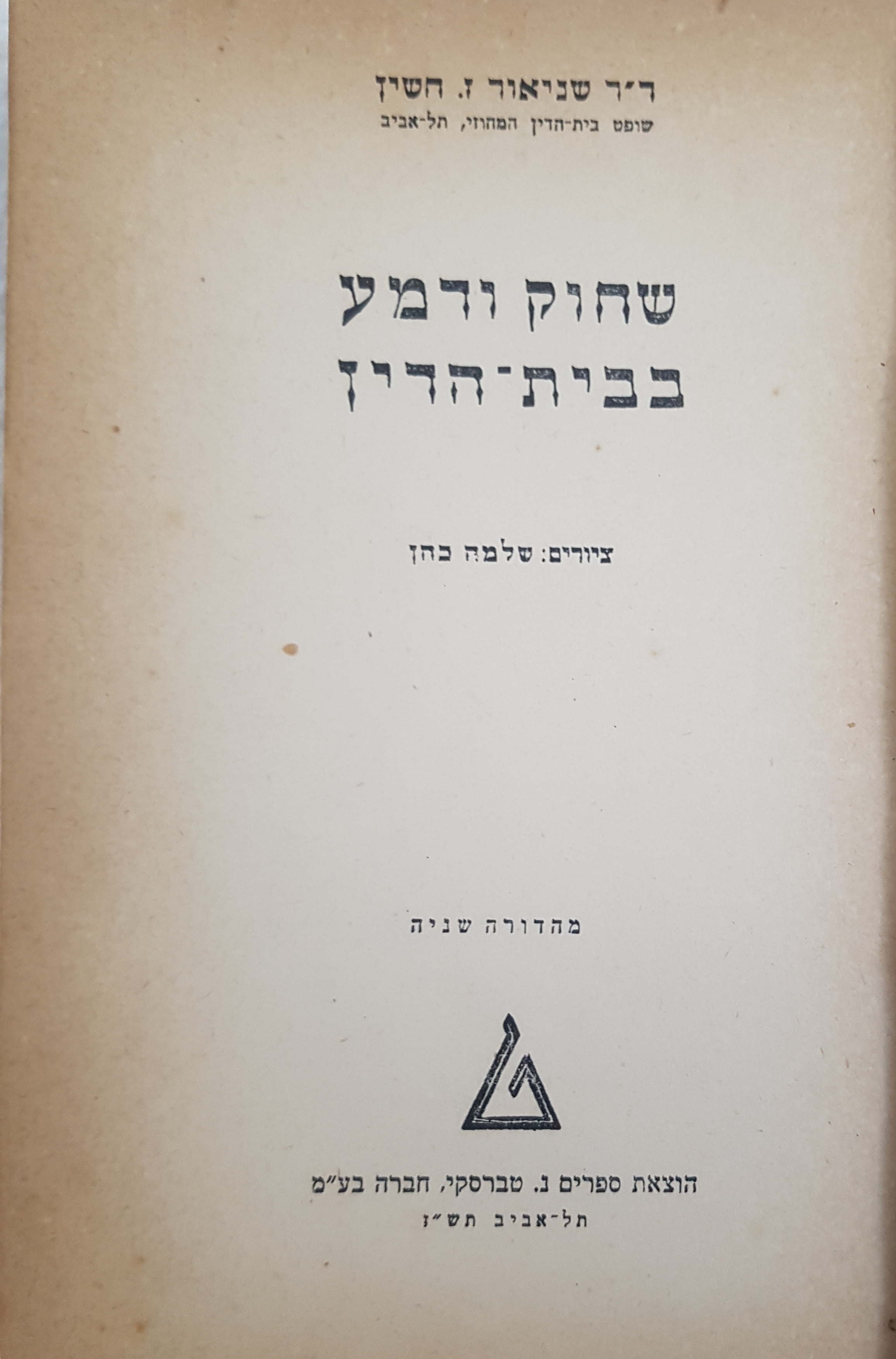 Judge Shneor Zalman Cheshin Cheshin was a lawyer, 1933-1936; a Justice of the Peace,1937-1944, District Tel Aviv Judge, 1944-1948; and one of five justices of the newly form State of Israel 1948-1959. In 1944, he was given a half-hour bi-monthly broadcast (roughly every two weeks), in Hebrew, to talk about his experiences in the court. The program's name was translated in the Palestine Post as a variation of " The Court Mirror: Impressions from the Law Court" In Hebrew it was named "Perakim Min Ha'vavei Hayehudi B'Beit Hamishpat" פרקים מן ההווי היהודי בבית המשפט Only 6 or 7 of the transcripts appear in the Hagalgal magazine,out of a total of 34 talks in the fist series. Cheshin took these 34_talks and edited them into a book, in 1946, entitled in Hebrew, S'chock, V' Dema B'Beit Din ( "Laughter and Tears in the Court") Cheshin's book Laughter and Tears in the Courtroom" was based on the transcripts of the series of thirty-four "conversations" on the topic "Episodes from the Jewish identity in the court" in the "Hebrew Hour". Cheshin edited the original transcripts, expanding the talk on several topics and adding new material from his daily work.