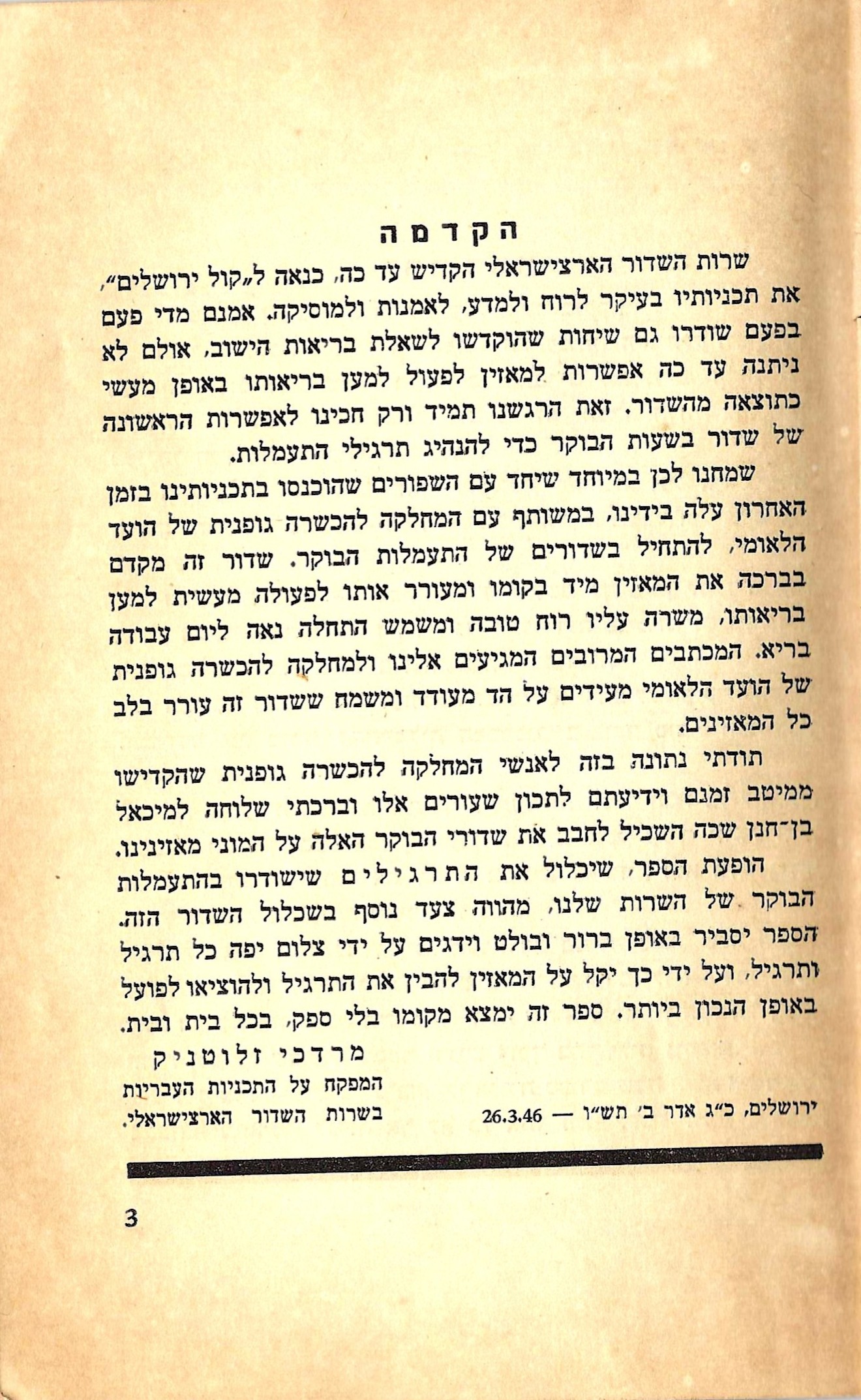 ירושלים, כ''ג אדר ב' תש''ו - 26.3.46 English translation of foreword by Mordechai Zlotnik, via ChatGPT: **Introduction** The Palestine Broadcasting Service has so far devoted its programs, fittingly for "Kol Yerushalayim," primarily to culture and science, art and music. Although from time to time, talks addressing the health of the community have been broadcast, there has not yet been an opportunity for listeners to take practical steps to improve their health as a result of these broadcasts. We have always felt this gap and have been waiting for the first opportunity to broadcast during morning hours to introduce exercise routines. We were therefore particularly pleased that, along with the recent improvements in our programming, we were able, in collaboration with the Physical Training Department of the National Committee, to launch morning exercise broadcasts. This broadcast greets listeners immediately upon waking, inspires them to take practical steps for their health, uplifts their spirits, and provides a positive start to a healthy workday. The many letters we and the Physical Training Department of the National Committee have received testify to the encouraging and gratifying impact this broadcast has had on all our listeners. My thanks are hereby extended to the staff of the Physical Training Department, who have dedicated their time and expertise to designing these lessons, and my warm greetings to Michael Ben-Hanan, who has skillfully made these morning broadcasts so beloved by our many listeners. The publication of the book, which will include the exercises broadcast in our morning exercise program, represents an additional step in enhancing this broadcast. The book will clearly and prominently explain each exercise and illustrate it with beautiful photographs, making it easier for listeners to understand and perform the exercises correctly. This book will undoubtedly find its place in every household.